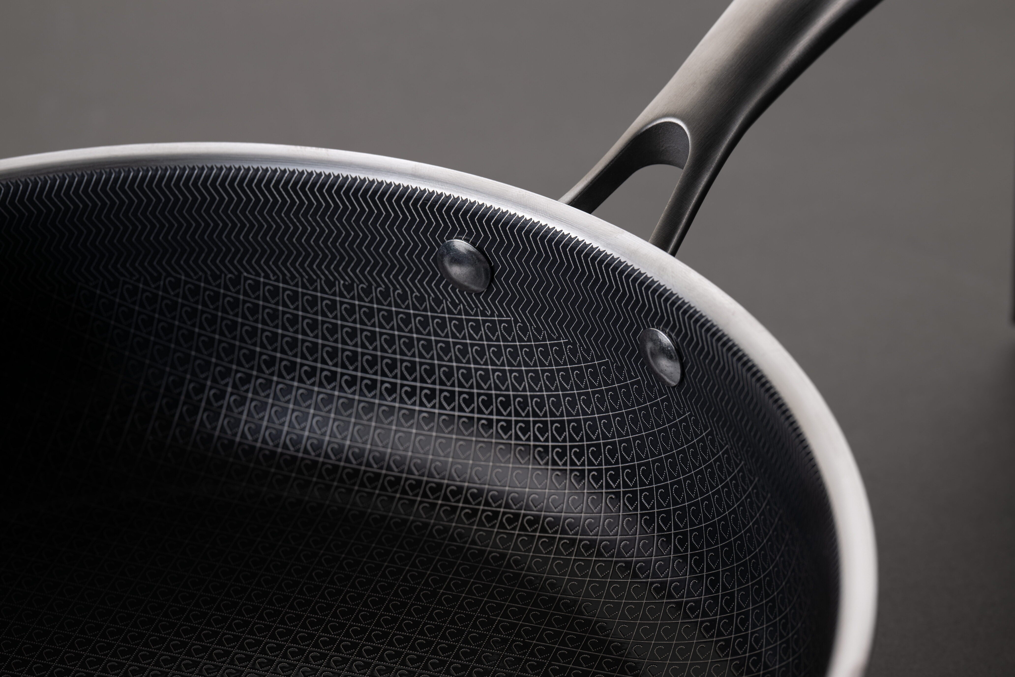 Det firkantede mønster med et “J” i midten er ikke kun for udseendets skyld – det spiller en afgørende rolle i stegeoplevelsen. Mønstret hæver maden let over den keramiske belægning, så fedtstof kan flyde frit rundt, hvilket forhindrer maden i at brænde på og sætte sig fast.